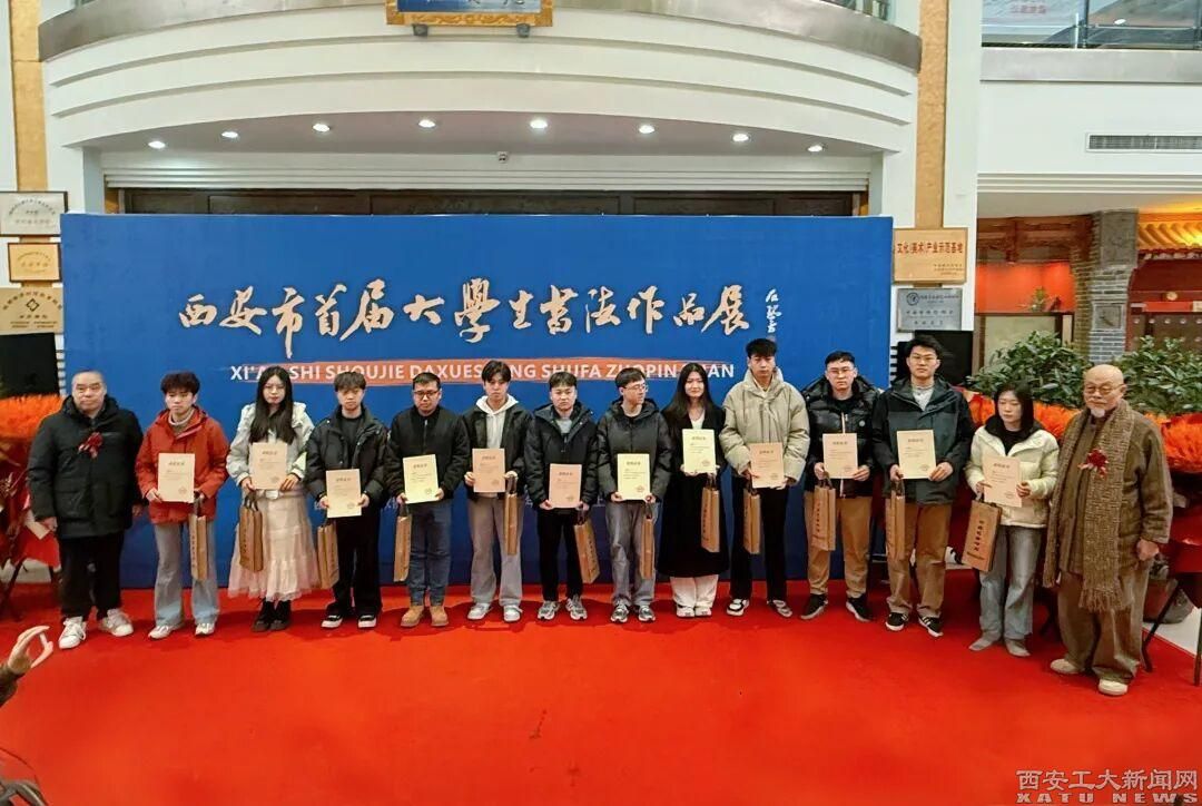 (本网讯)1月10日上午,由西安市文学艺术界联合会指导,西安市书法家协会主办的“西安市首届大学生书法作品展”在亮宝楼开幕。我校中国书法学院10名学子的作品脱颖而出,获得优秀奖与入展资格(其中研究生3人获得优秀奖,3人入展;本科生1人获得优秀奖,5人入展),学院荣获优秀组织奖,充分展现了学院师生扎实的专业素养与深厚的艺术功底。