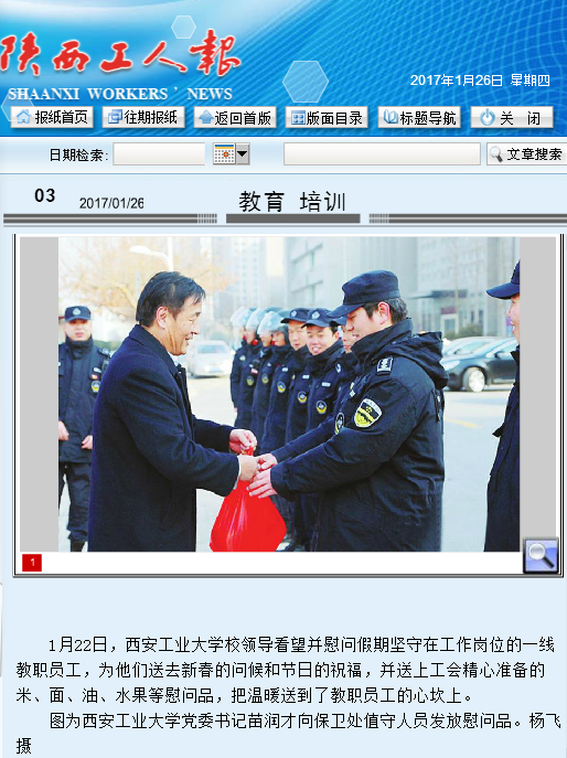 1月22日,西安工业大学校领导看望并慰问假期坚守在工作岗位的一线教职员工,为他们送去新春的问候和节日的祝福,并送上工会精心准备的米、面、油、水果等慰问品,把温暖送到了教职员工的心坎上。 图为西安工业大学党委书记苗润才向保卫处值守人员发放慰问品。杨飞